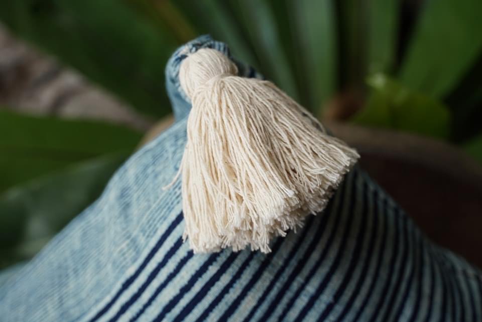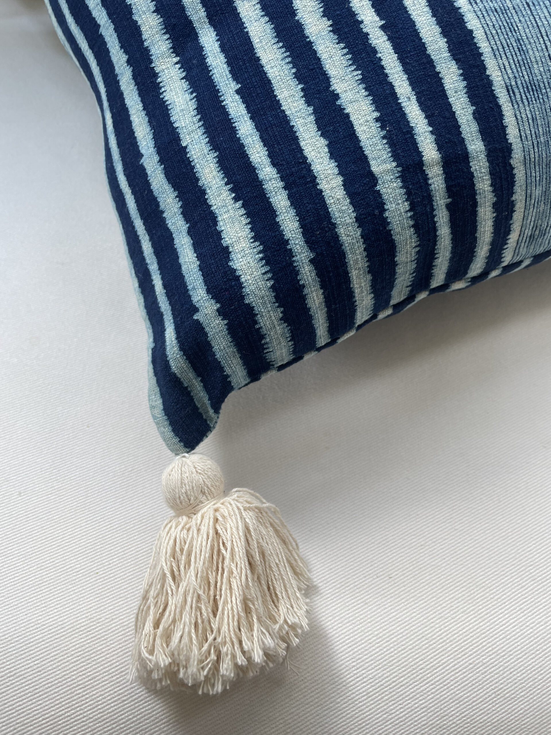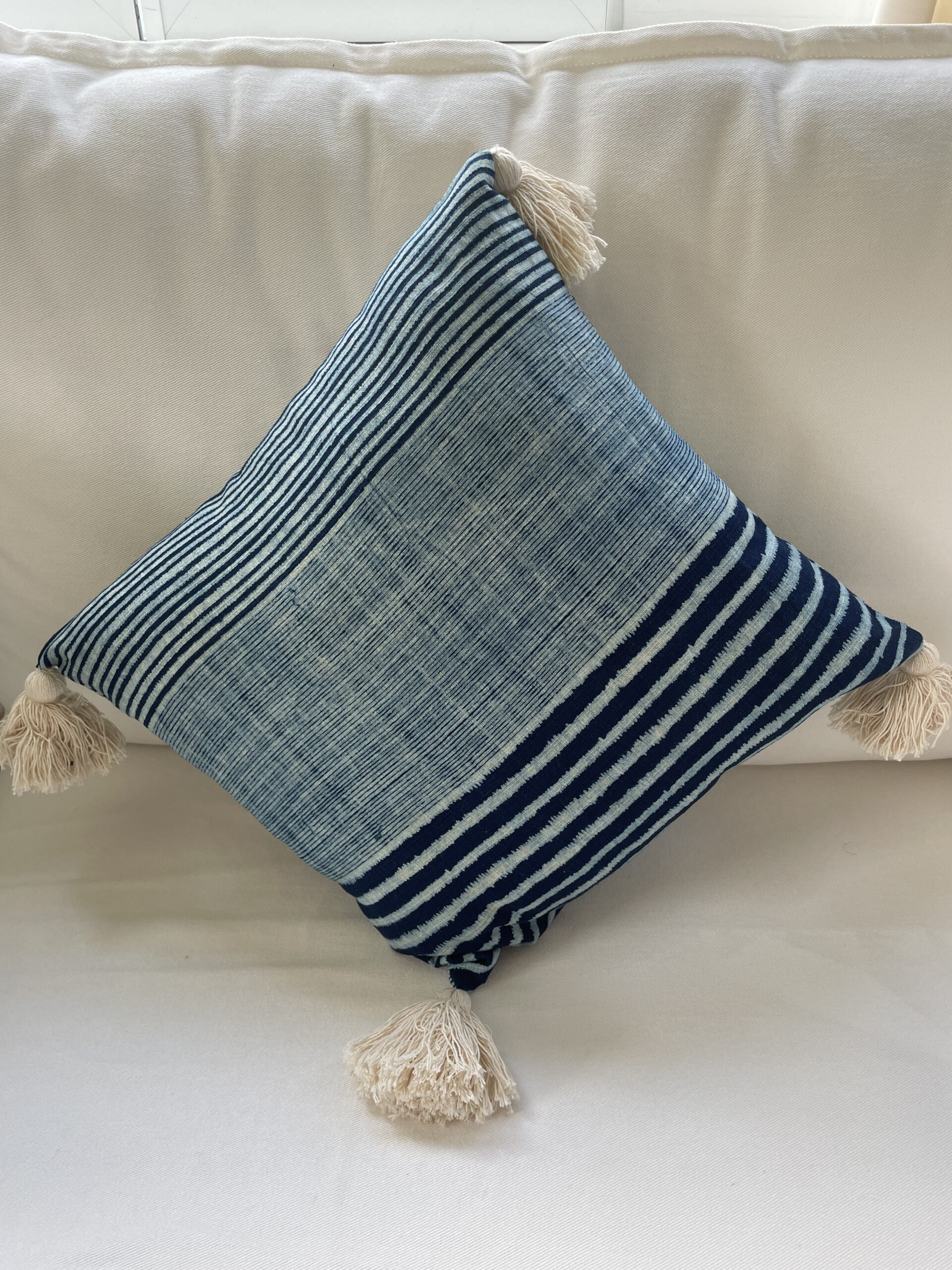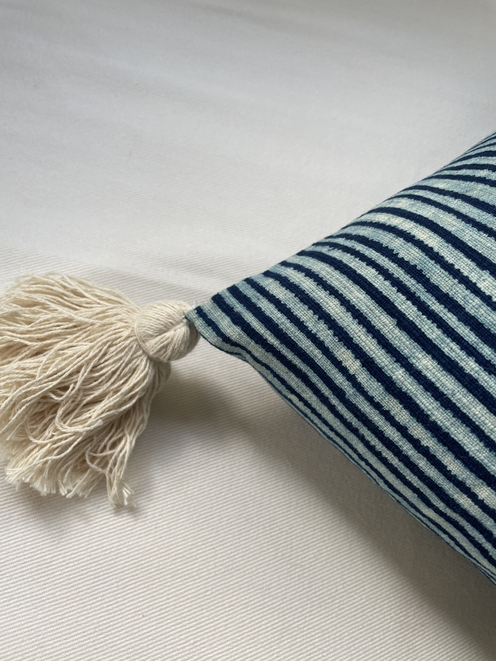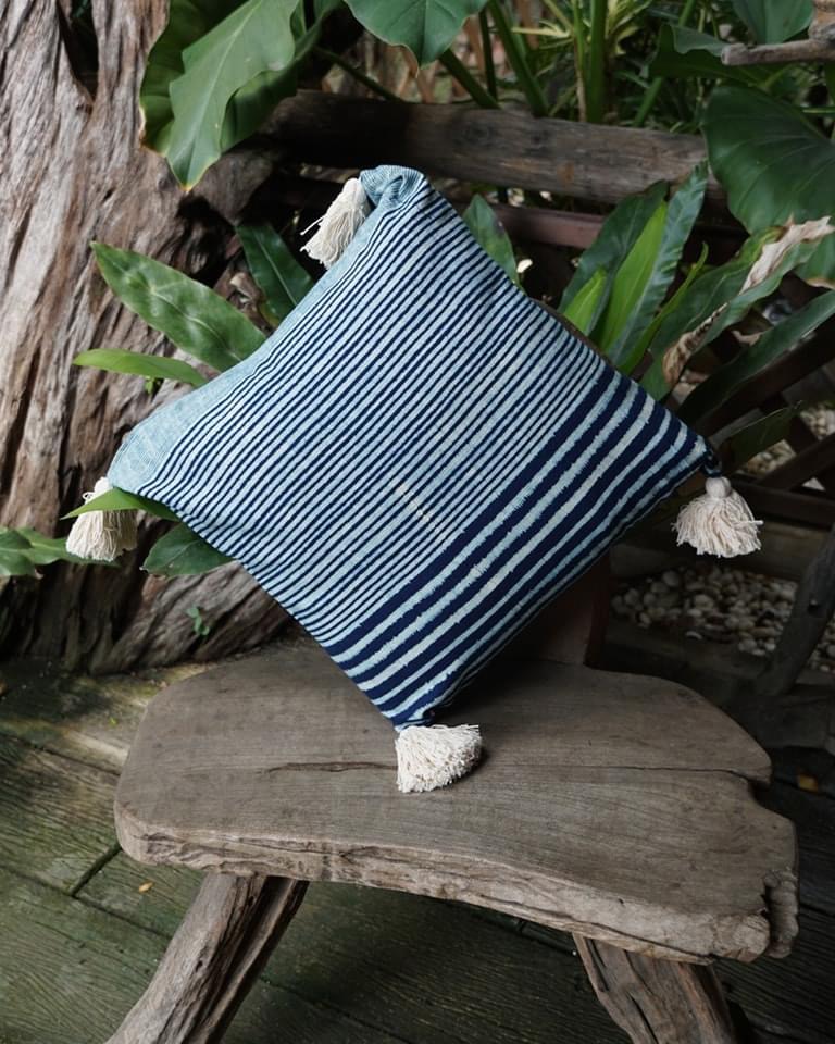 Thick cotton dyed with Chiang Mai natural indigo, this fabric features a timeless stripe pattern making it versatile and warmth addition to your room with added playful cotton tassels.