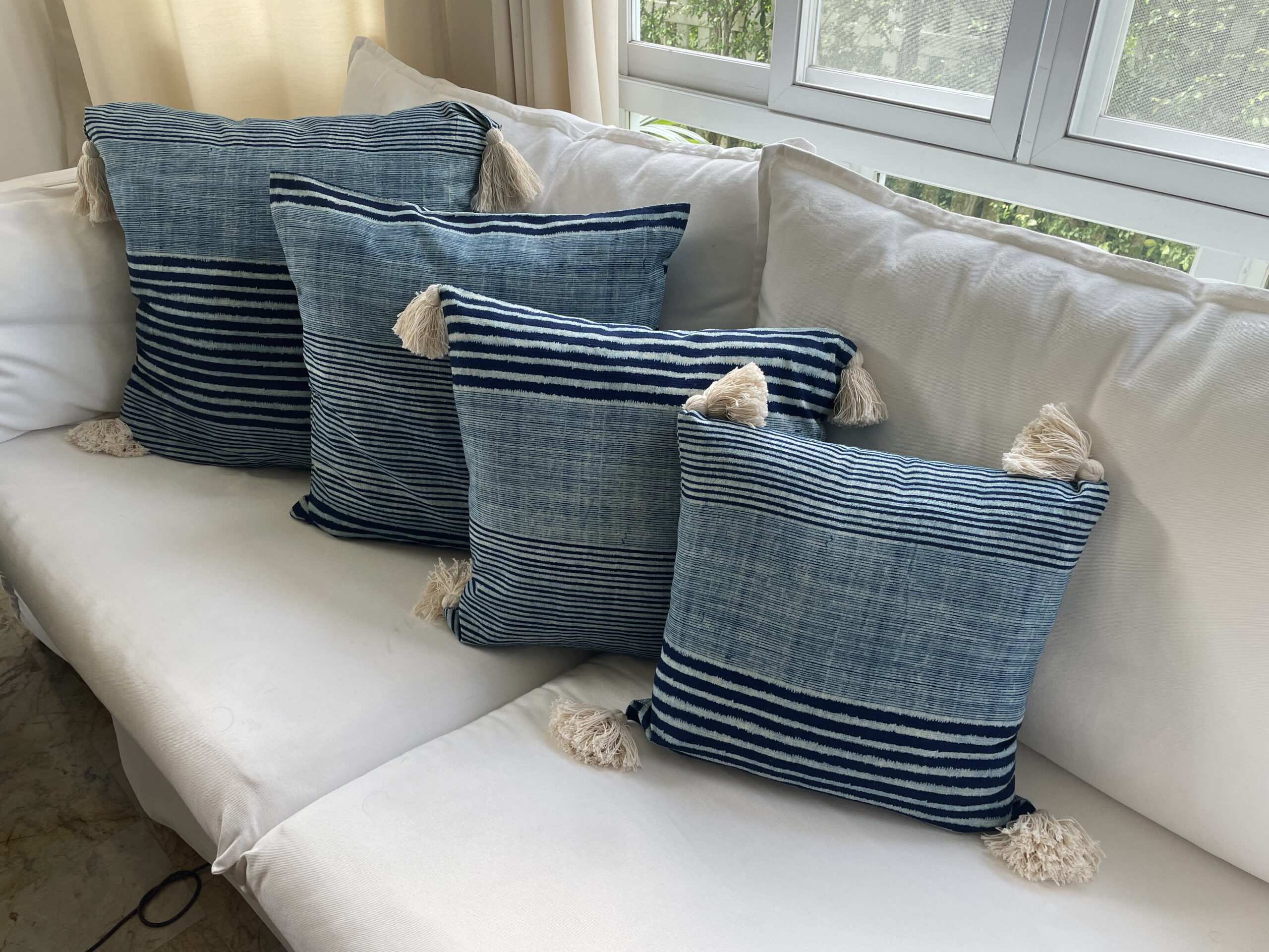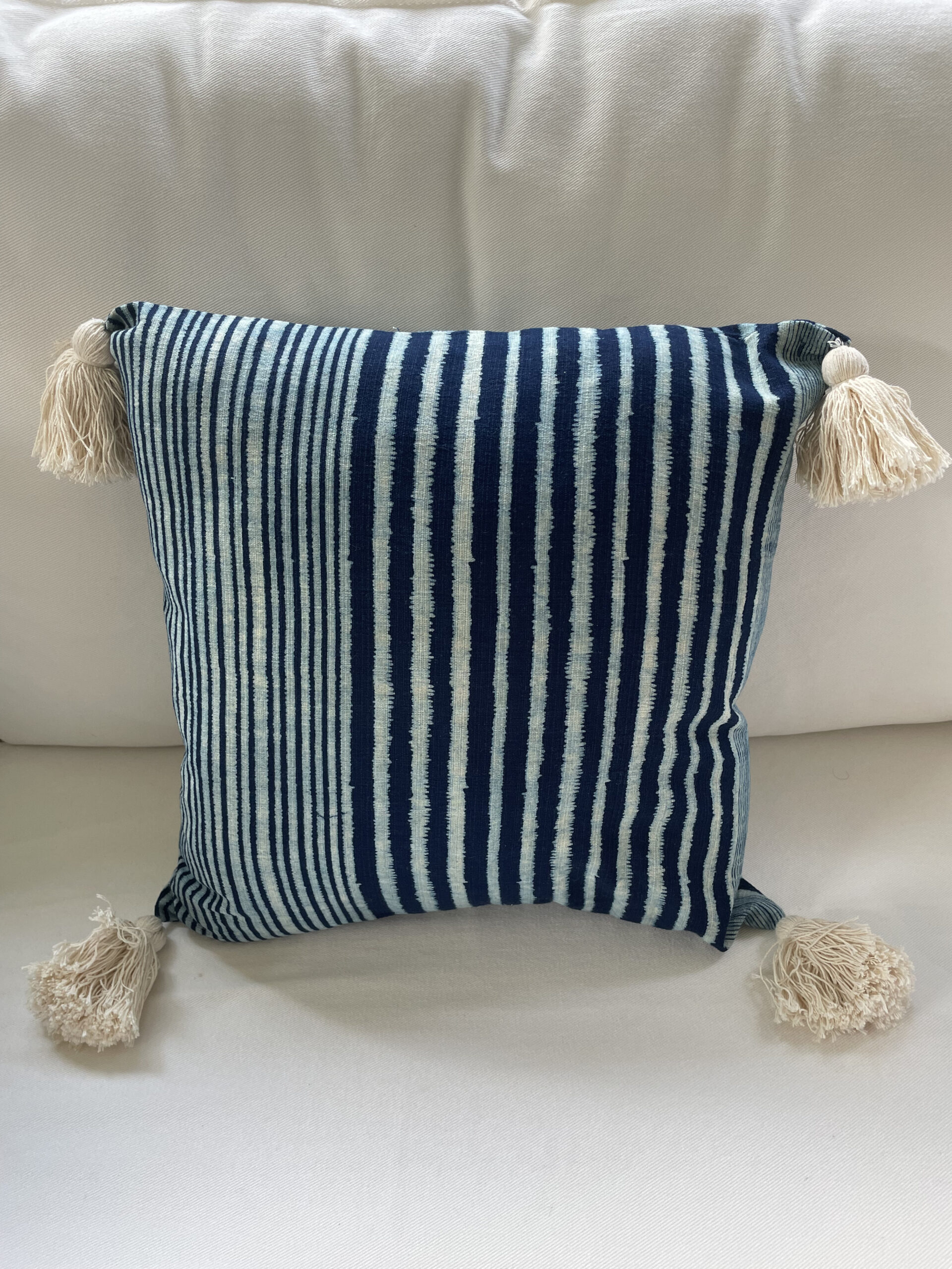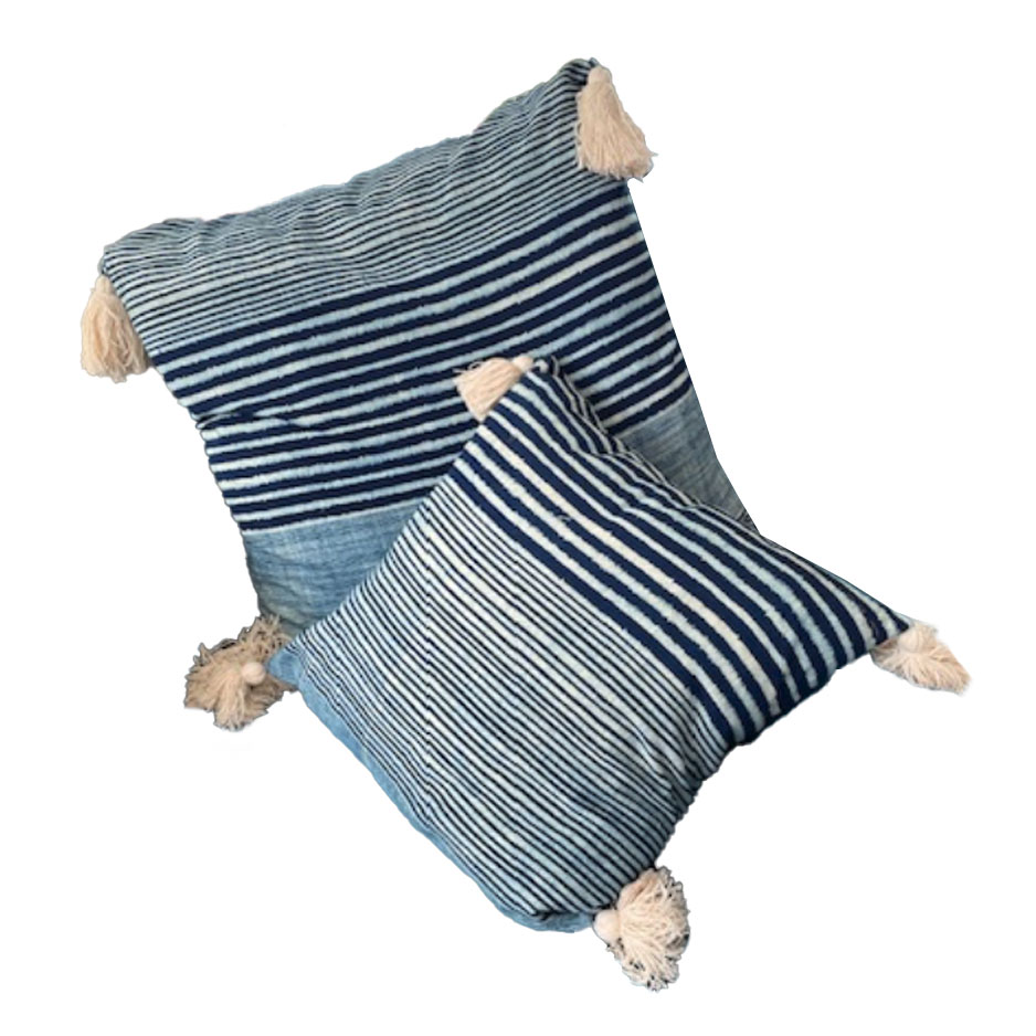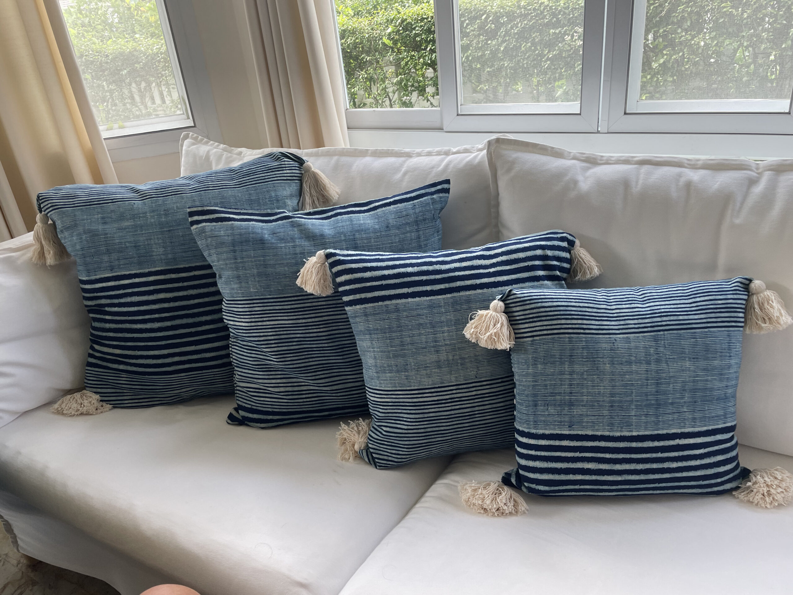 Thick cotton dyed with Chiang Mai natural indigo, this fabric features a timeless stripe pattern making it versatile and warmth addition to your room with added playful cotton tassels.