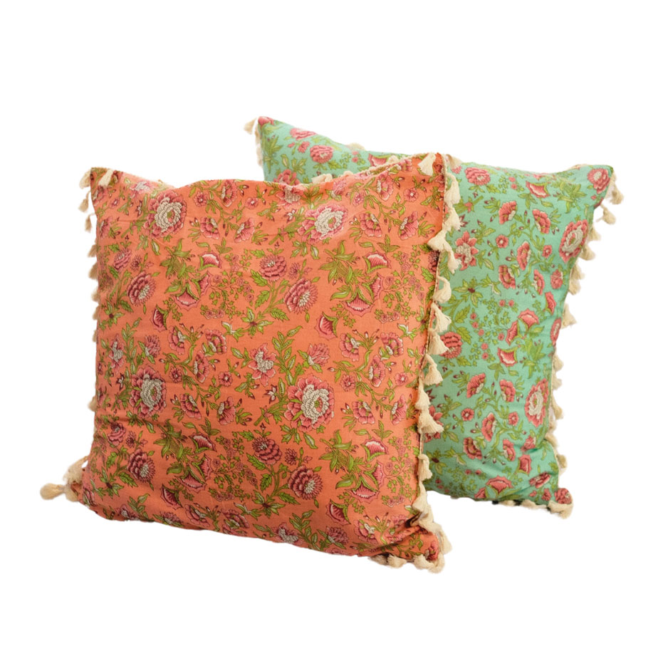 Indian cotton hand block print throw cushion covers decorated with trimmings- set of 2