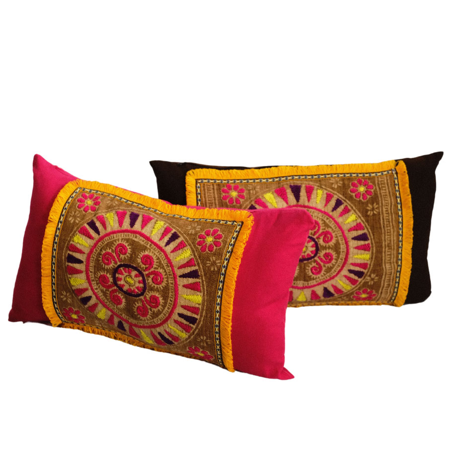 Hemp Hmong hand-block print with colourful hand embroidery and tassels on Chiang Mai cotton lumbar cushion covers- set of 2