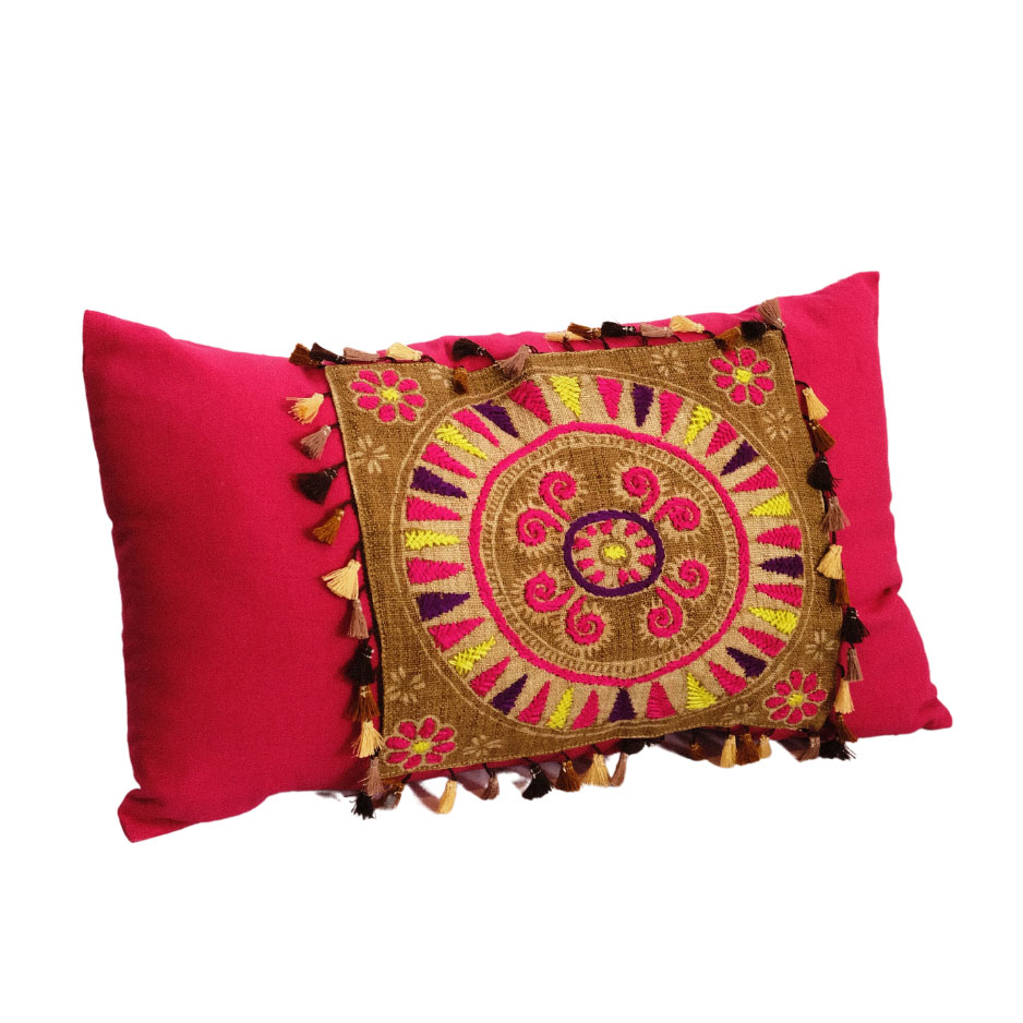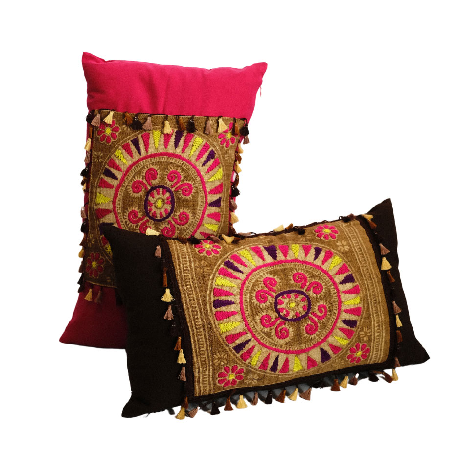 Hemp Hmong hand-block print with colourful hand embroidery and tassels on Chiang Mai cotton lumbar cushion covers – set of 2
